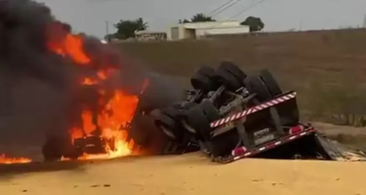 Na tarde desta quarta-feira (28), um caminhão carregado com milho tombou e pegou fogo na rodovia SE-170, entre os municípios de Graccho Cardoso e Feira Nova, no médio sertão sergipano.