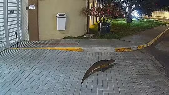 Um jacaré foi registrado por câmeras de segurança circulando próximo à portaria de um condomínio de casas localizado no Bairro Aruana, em Aracaju. As imagens foram divulgadas nesta sexta-feira (20).
