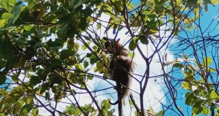 De acordo com os Bombeiros, o animal estava em cima de um cajueiro no quintal de uma residência e corria risco de ser atacado pelos cães da casa.